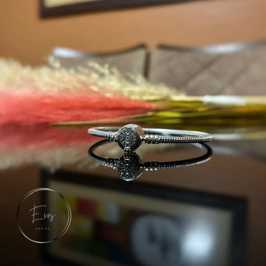 Brazalete Pandora Moments Cadena de Serpiente Corona Resplandeciente. Una pieza elegante en plata 925 que combina la sofisticación de la corona central cálida y brillosa con la suavidad y fluidez de la cadena serpiente. Perfecto para elevar cualquier outfit, solo o acompañado de tus charms favoritos...
